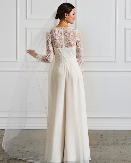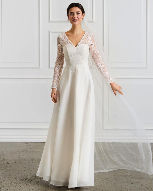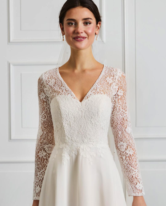 Robe de mariée en dentelle et mousseline. Top décolleté V en dentelle Doublé forme coeur. Manches longues en dentelle et dos en transparence. Jupe fluide en mousseline, sans traine. Robe ivoire disponible en boutique.