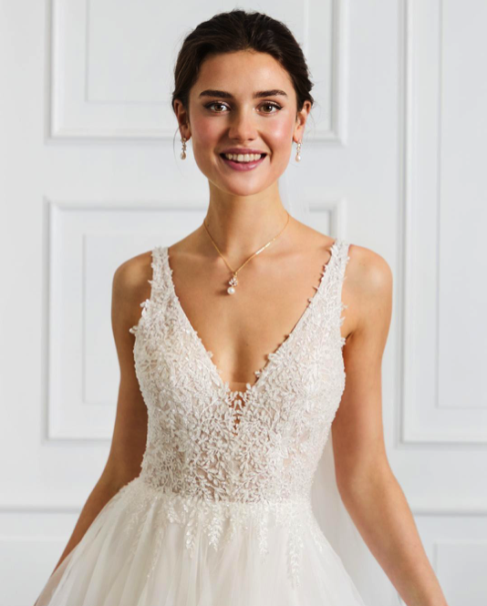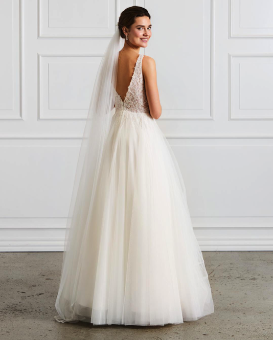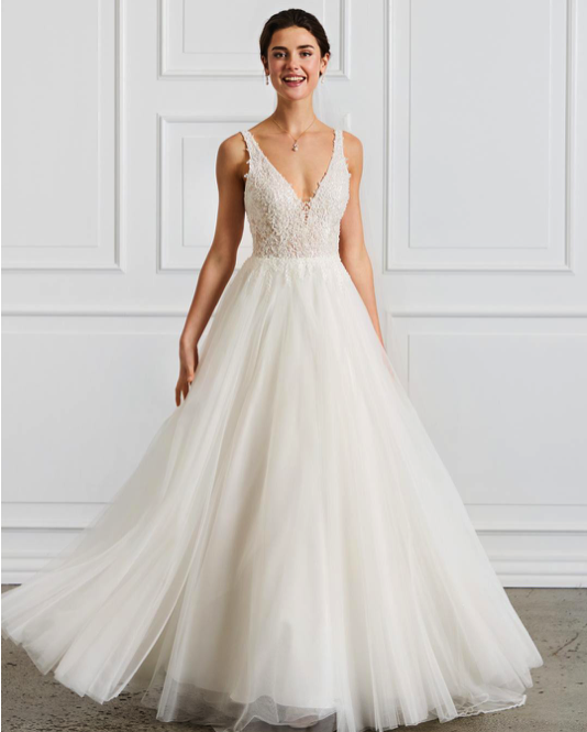 Robe de mariée en tulle et dentelle. Top décolleté V en dentelle fines bretelles. Dos en "V". Jupe forme "A" en tulle, sans traine. Robe ivoire disponible en boutique.