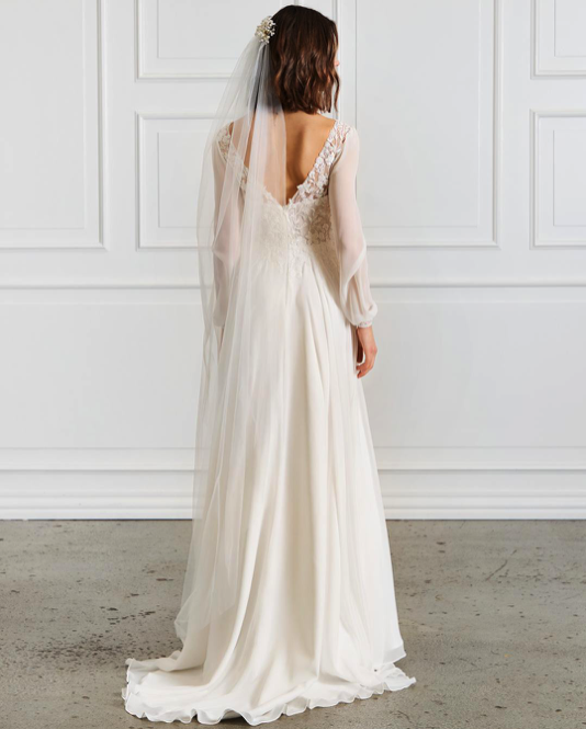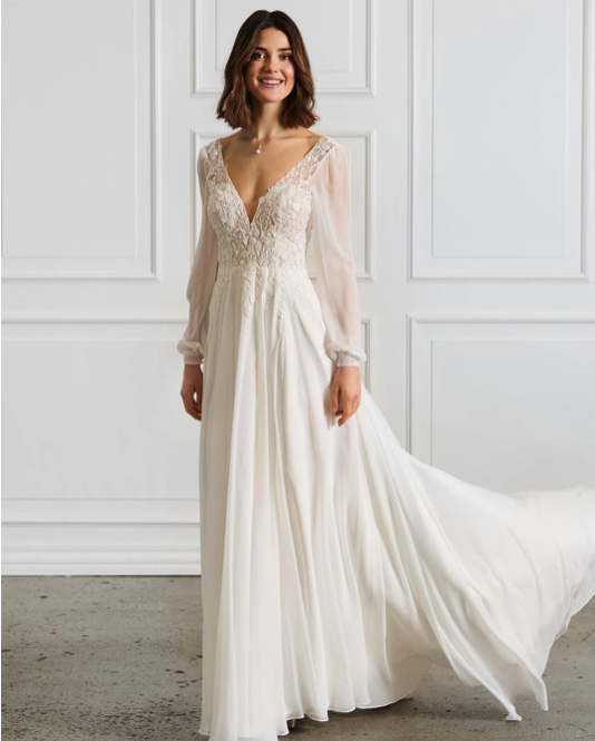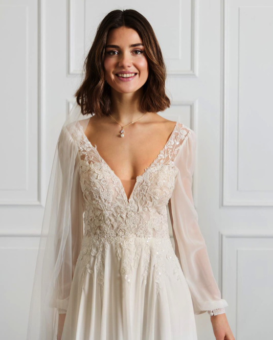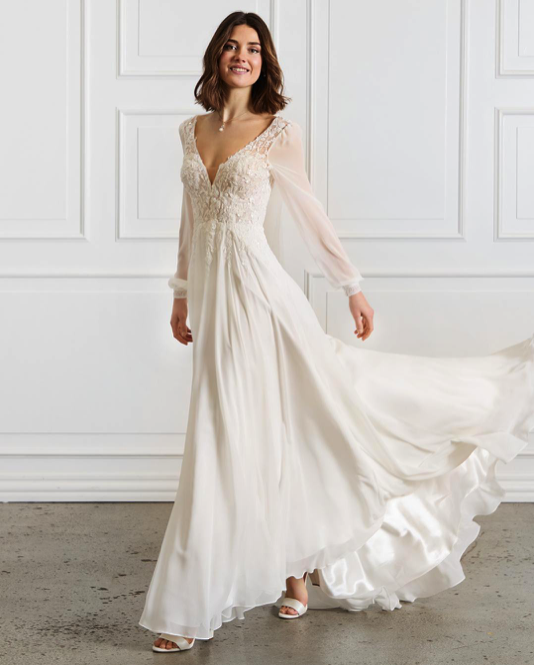 Robe de mariée en mousseline et dentelle. Top décolleté V en dentelle. Dos en V, manches longues fluides en mousseline. Jupe forme A en mousseline. Robe ivoire disponible en boutique.