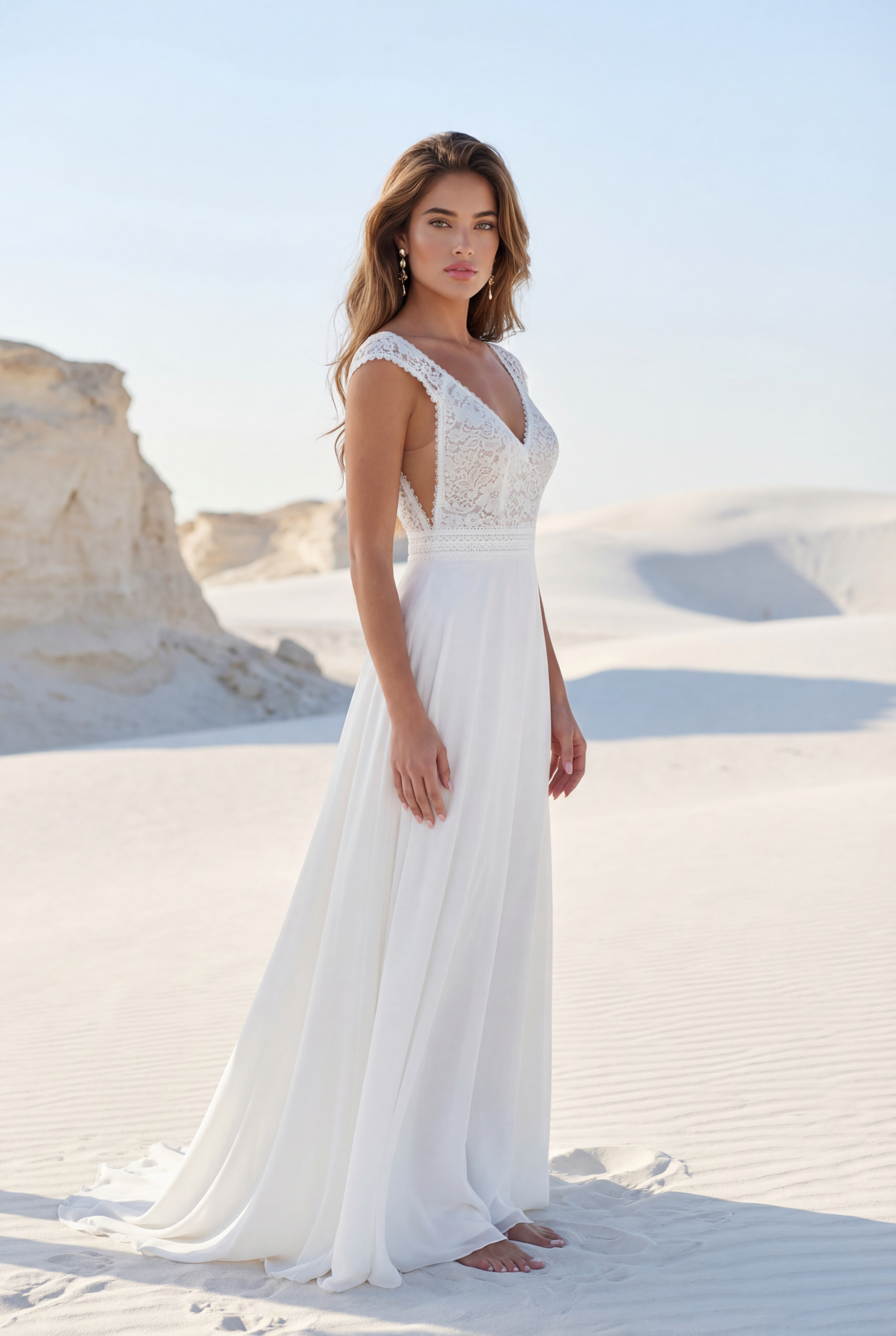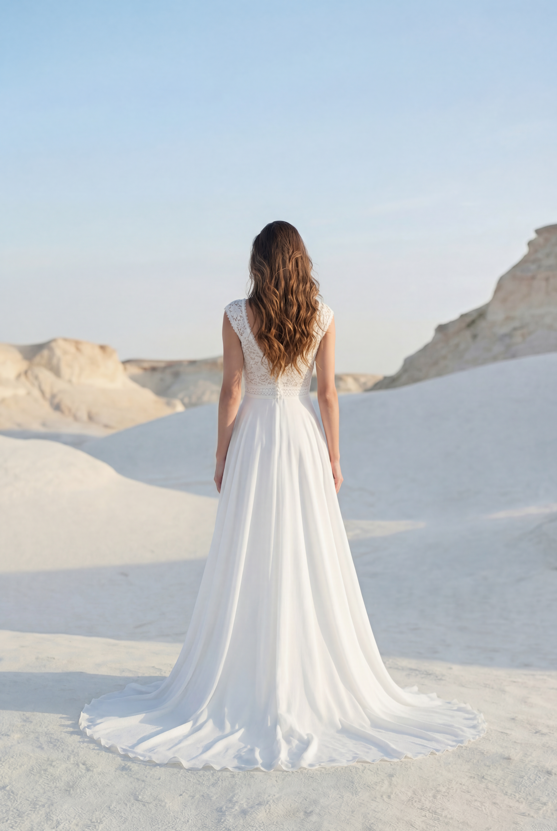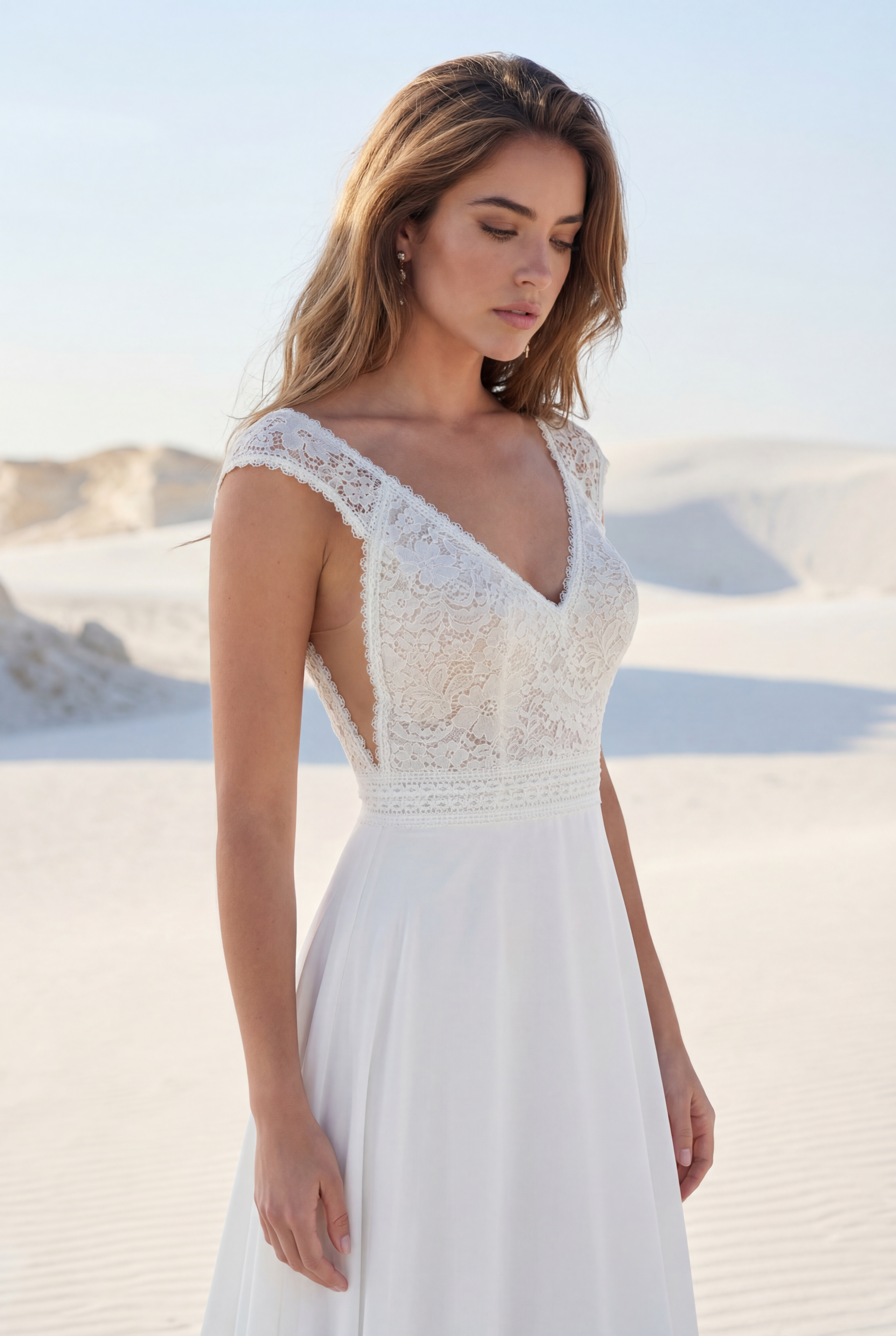 Robe de mariée en mousseline et dentelle. Top décolleté V en dentelle, petites manches, triangle transparents couleur peau côtés. Ceinture dentelle géométrique. Dos décolleté V, finition boutons. Jupe fluide en mousseline. Robe ivoire, côtés tulle peau proposée en boutique.