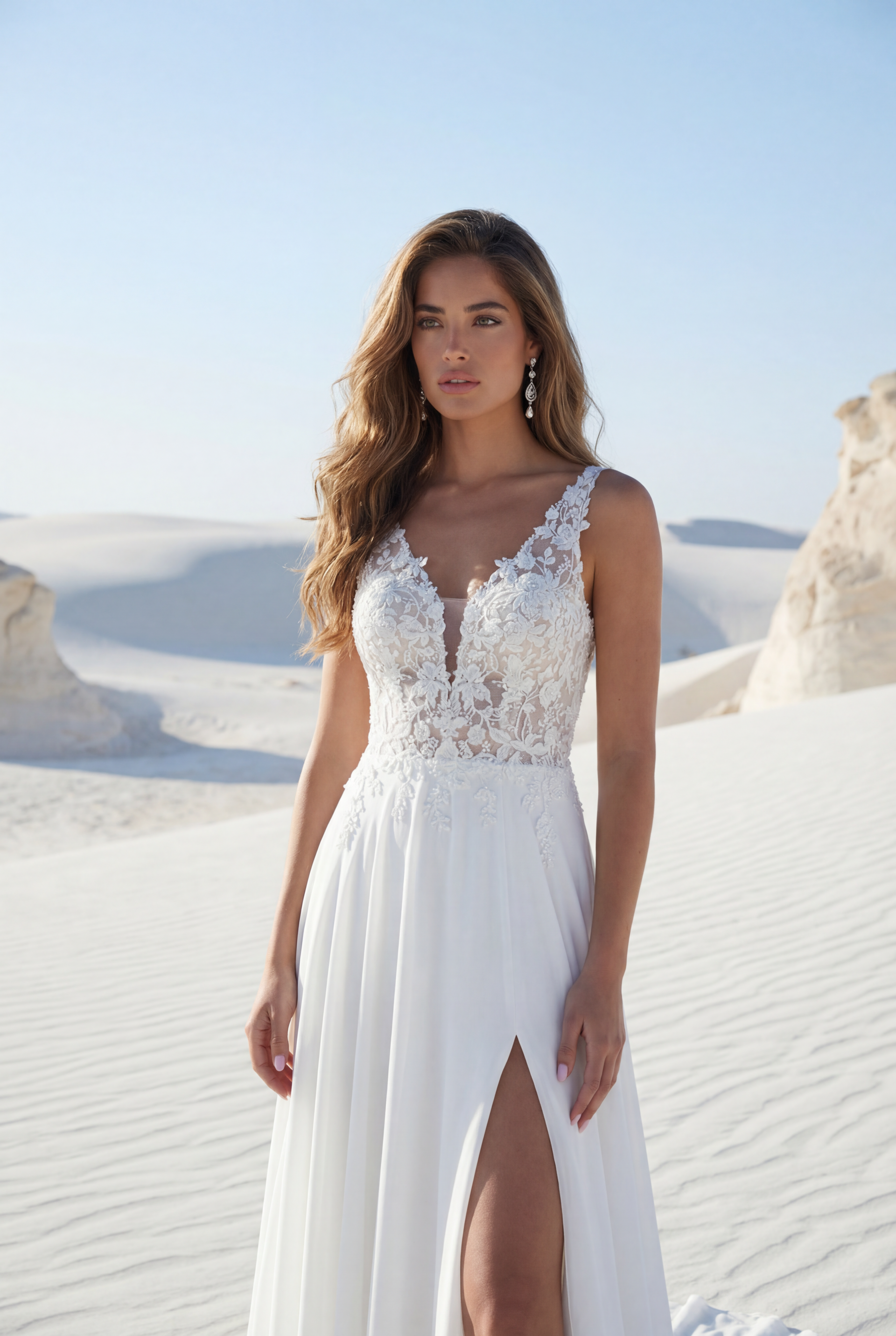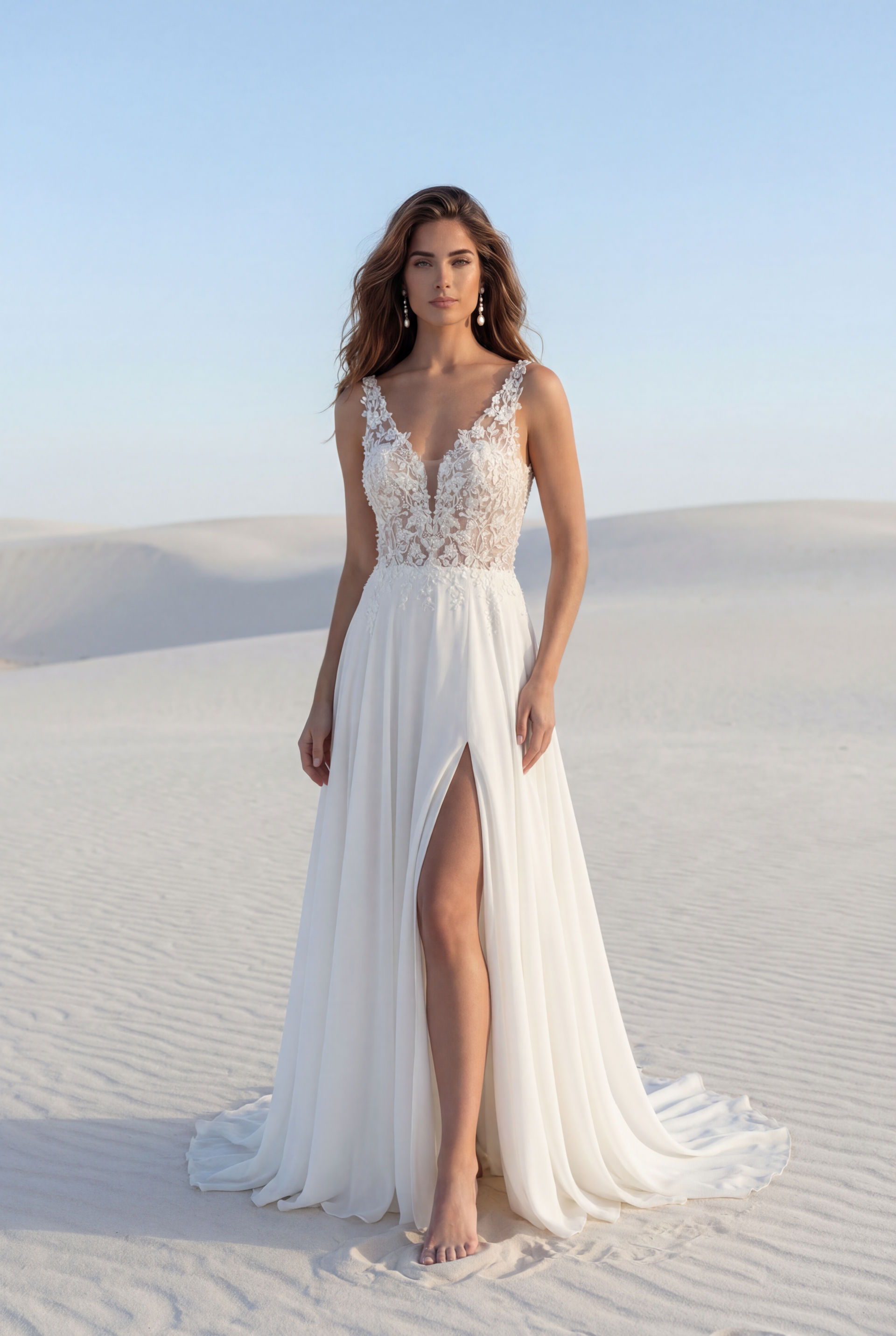 Robe de mariée dentelle perlée et mousseline. Top décolleté V en dentelle perlée, top doublé couleur peau. Bretelles dentelle. Dos décolleté V, fermeture boutons. Jupe fluide en mousseline avec fente. Robe ivoire top doublé peau proposée en boutique.