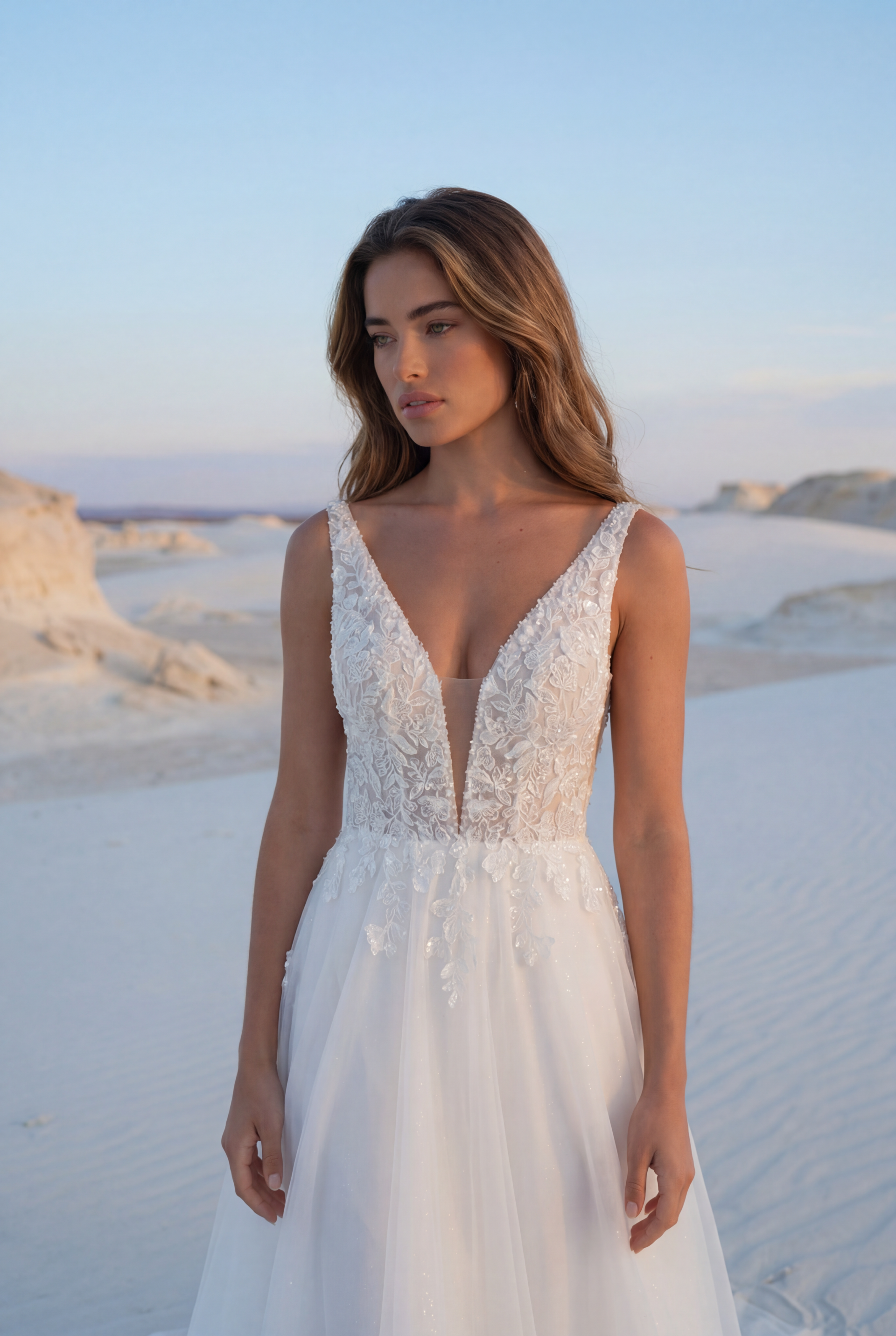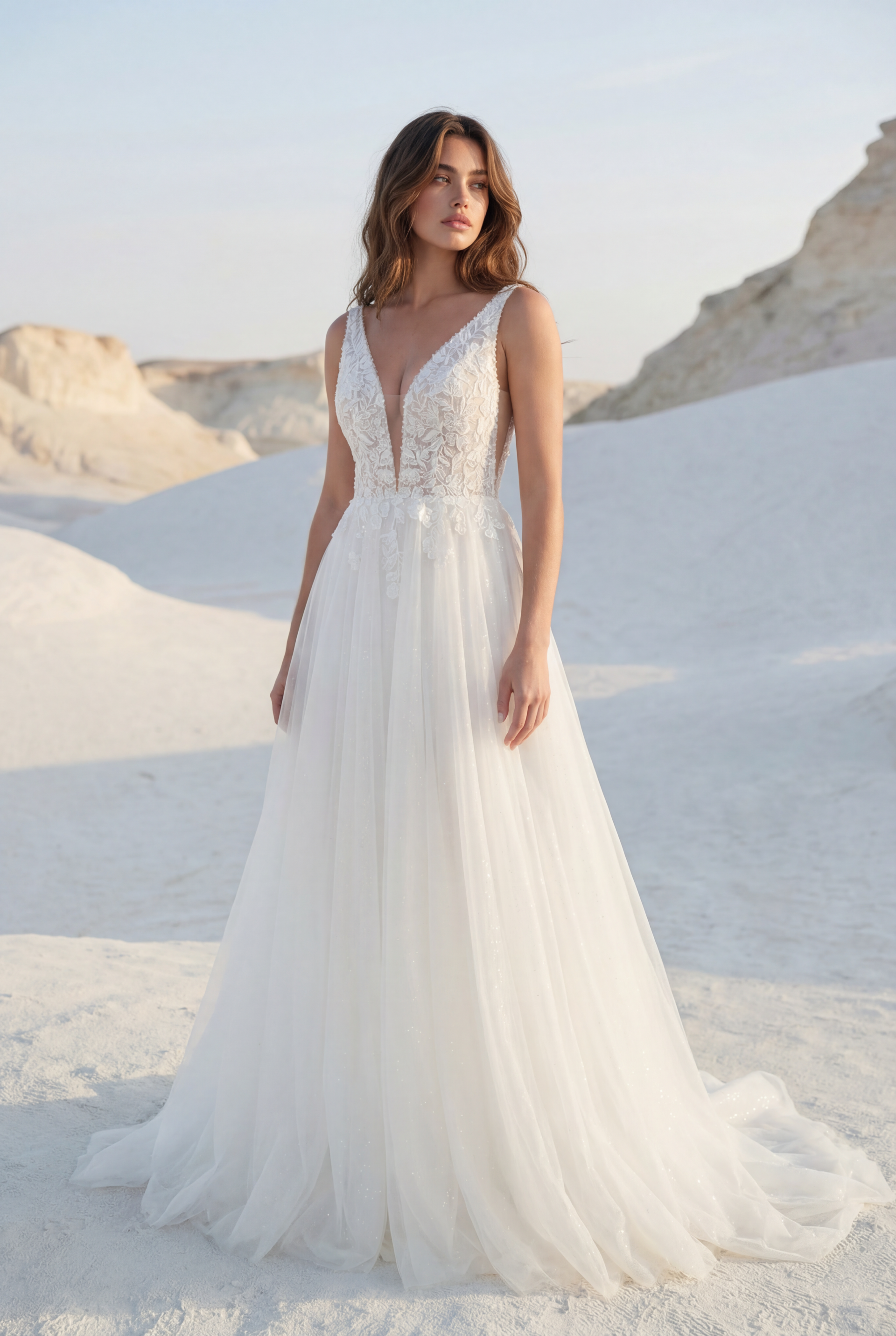 Robe de mariée dentelle perlée et tulle. Top décolleté V profond en dentelle , côtés en transparence, top doublé couleur peau. Bretelles dentelle. Dos décolleté V avec finition boutons. Jupe fluide en tulle. Robe ivoire top doublé peau proposée en boutique.