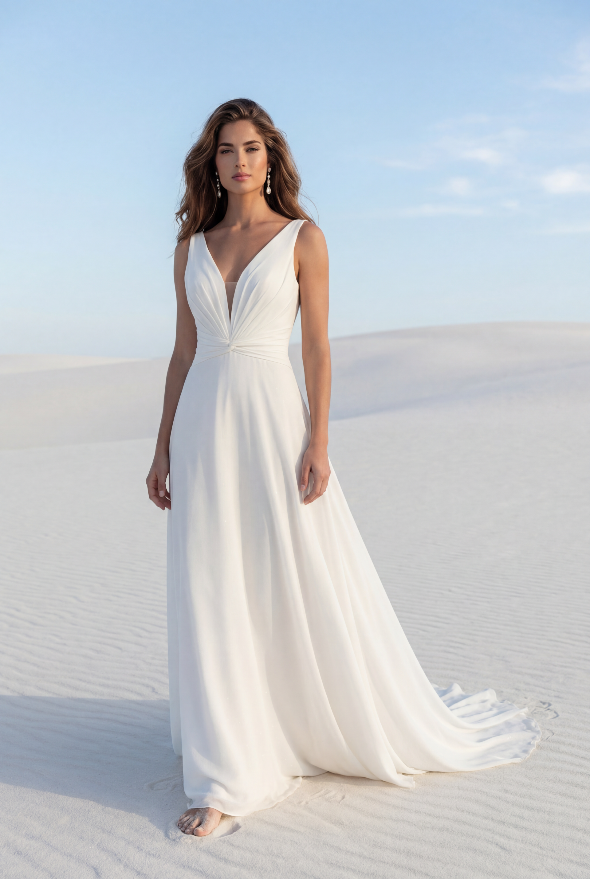 Robe de mariée en mousseline drapée. Top décolleté V en mousseline drapée. Bretelles . Dos décolleté V. Jupe fluide en mousseline. Robe ivoire.