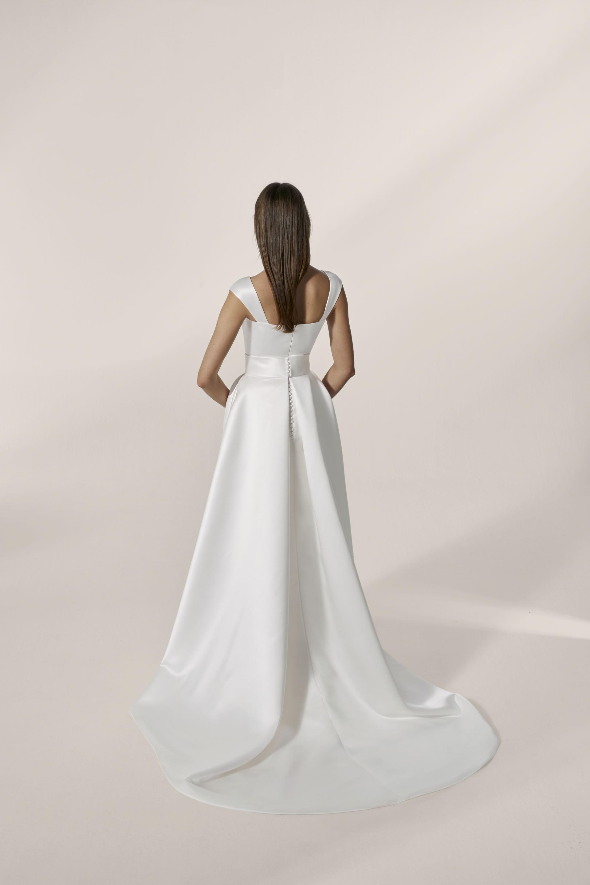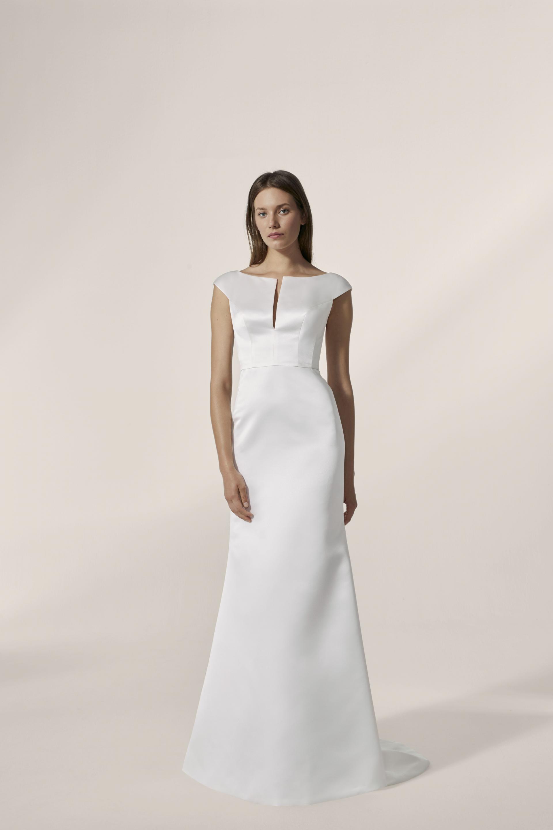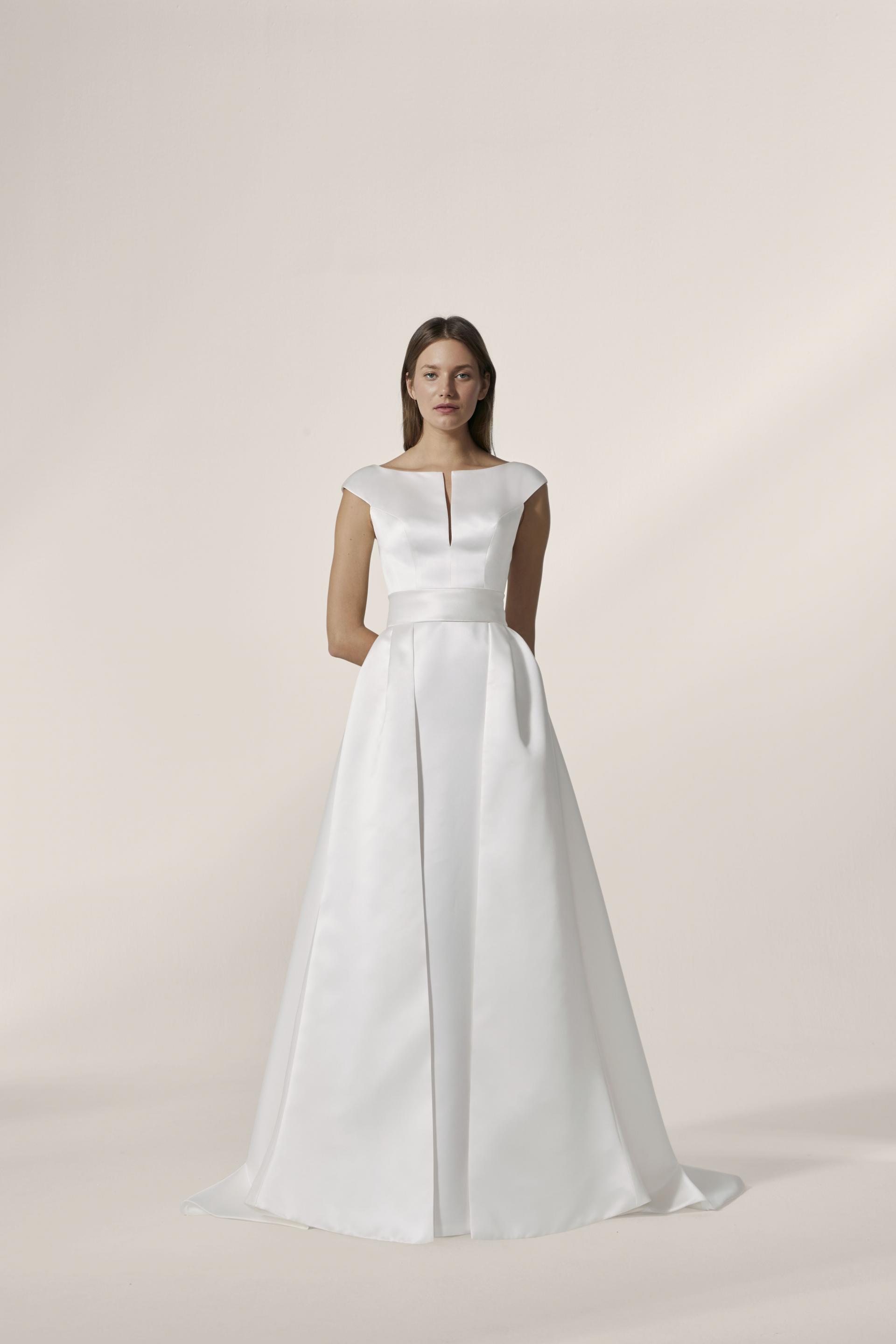 Robe de mariée en satin. Top décolleté fendu avec effet manches. Large ceinture drapée. Jupe droite en satin avec effet surjupe. Robe ivoire disponible en boutique.