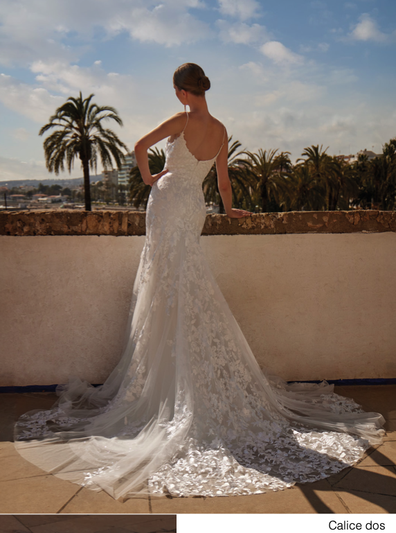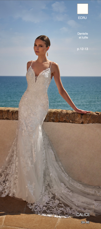 Robe de mariée en dentelle. Top décolleté coeur en dentelle. Dos décolleté V. Jupe forme sirène en dentelle. Robe ivoire proposée en boutique.