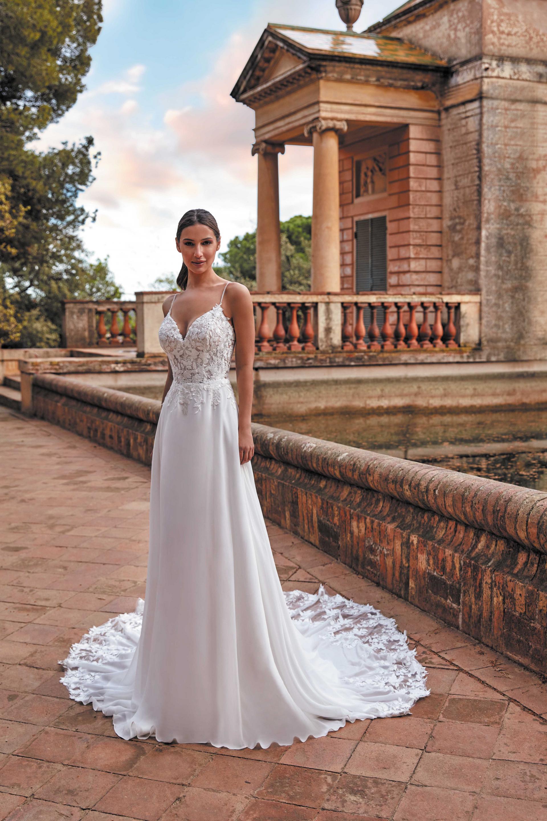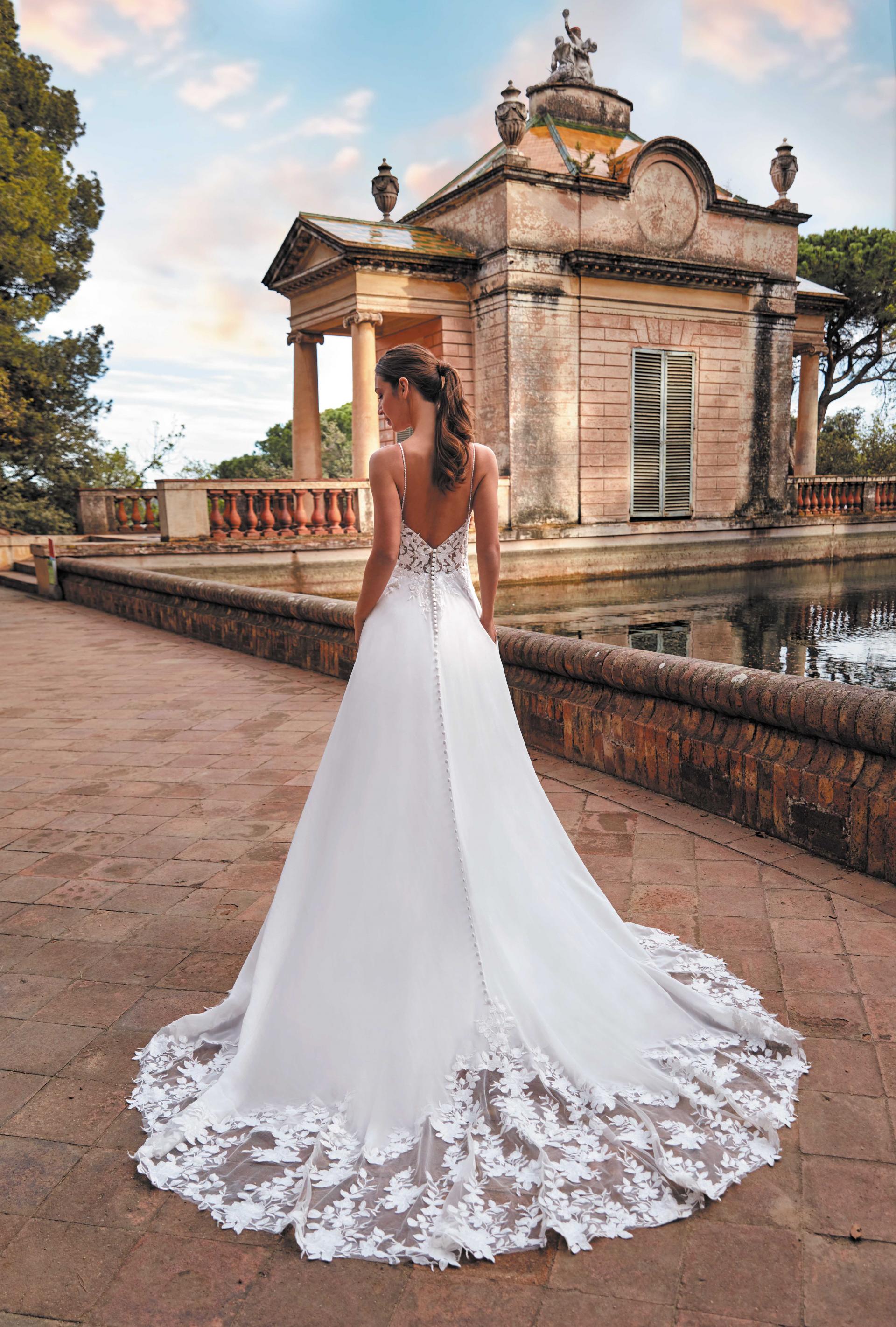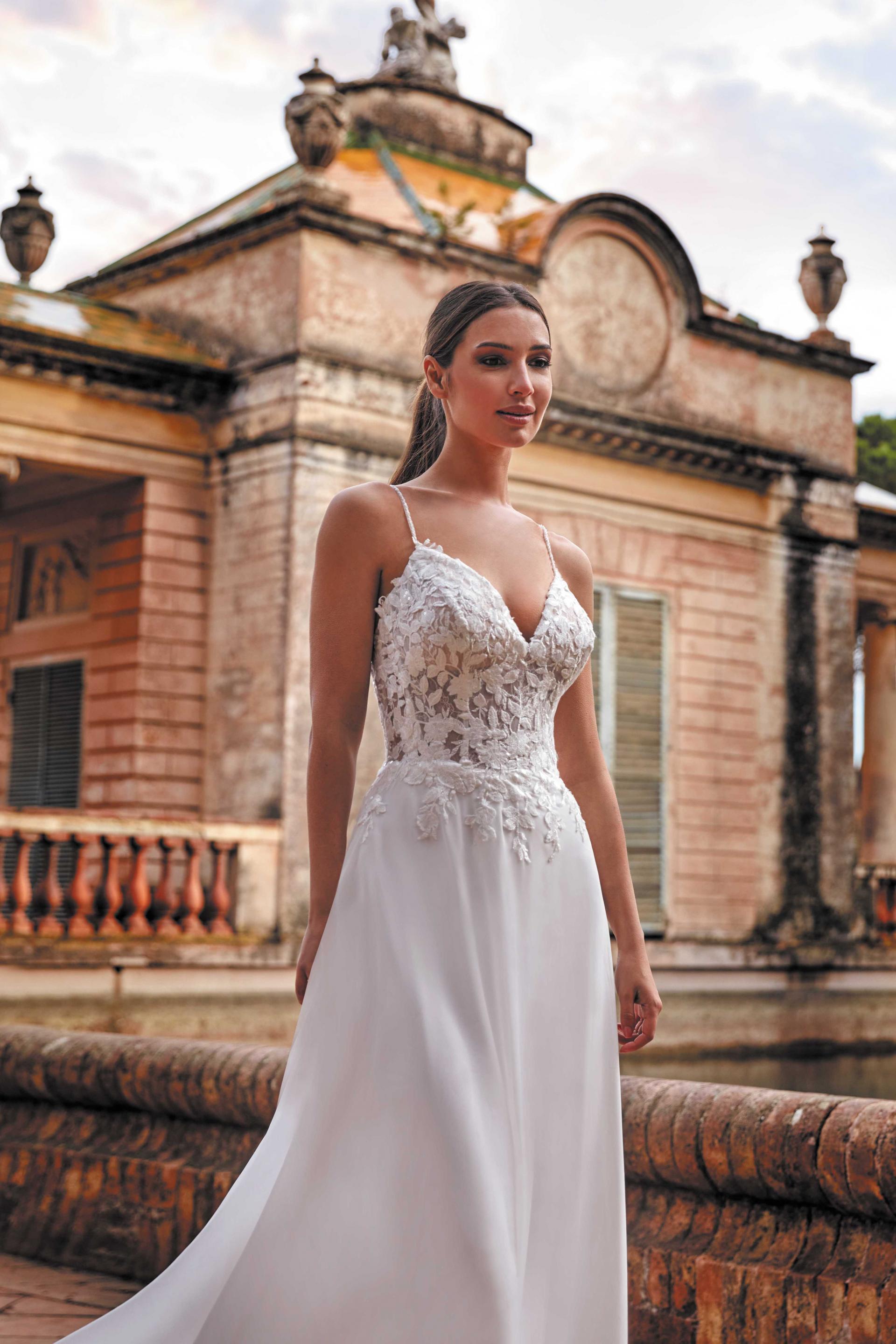 Robe de mariée en mousseline et dentelle. Top décolleté coeur en dentelle. Dos décolleté V et fines bretelles perlées. Jupe fluide en mousseline. Robe ivoire proposée en boutique.