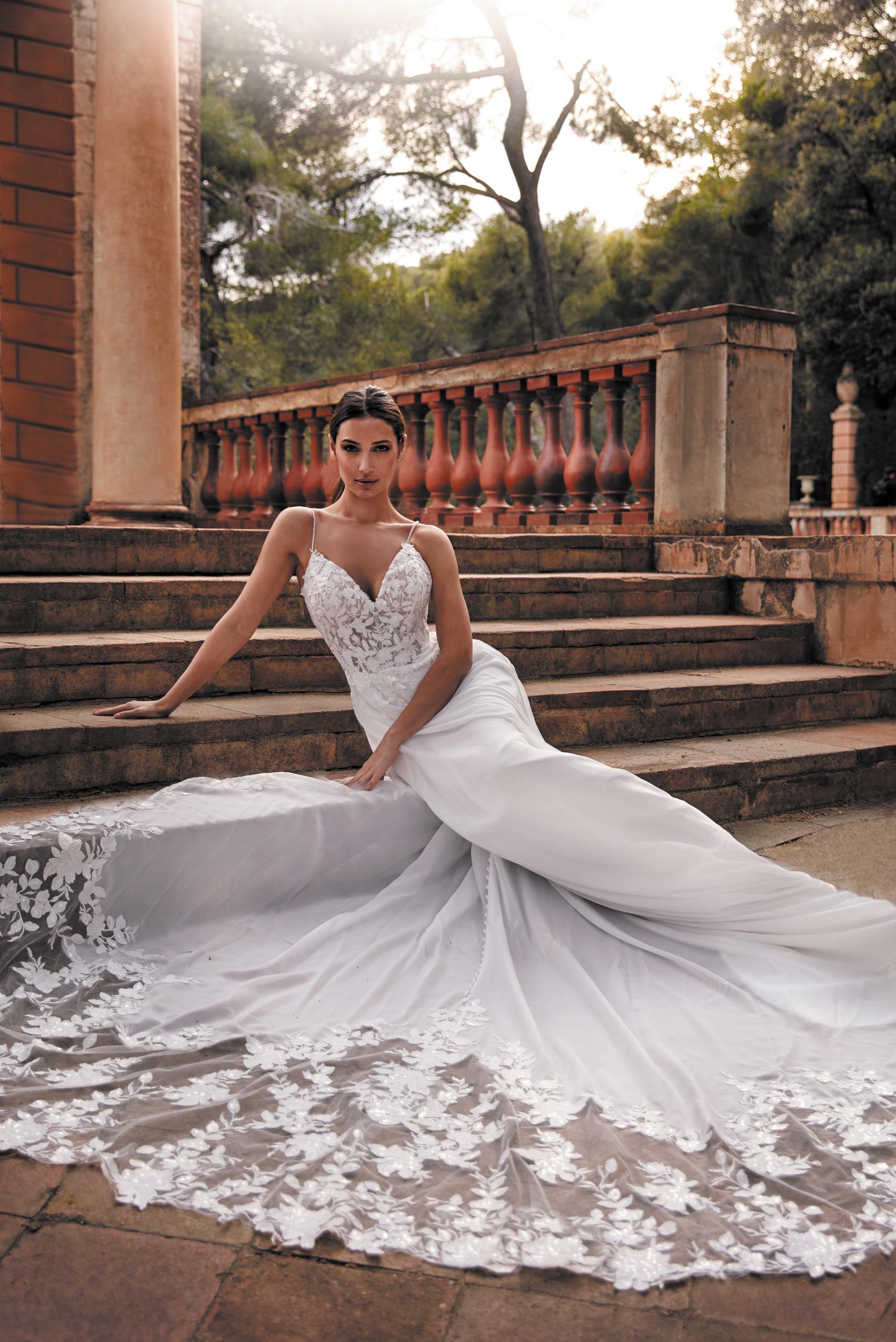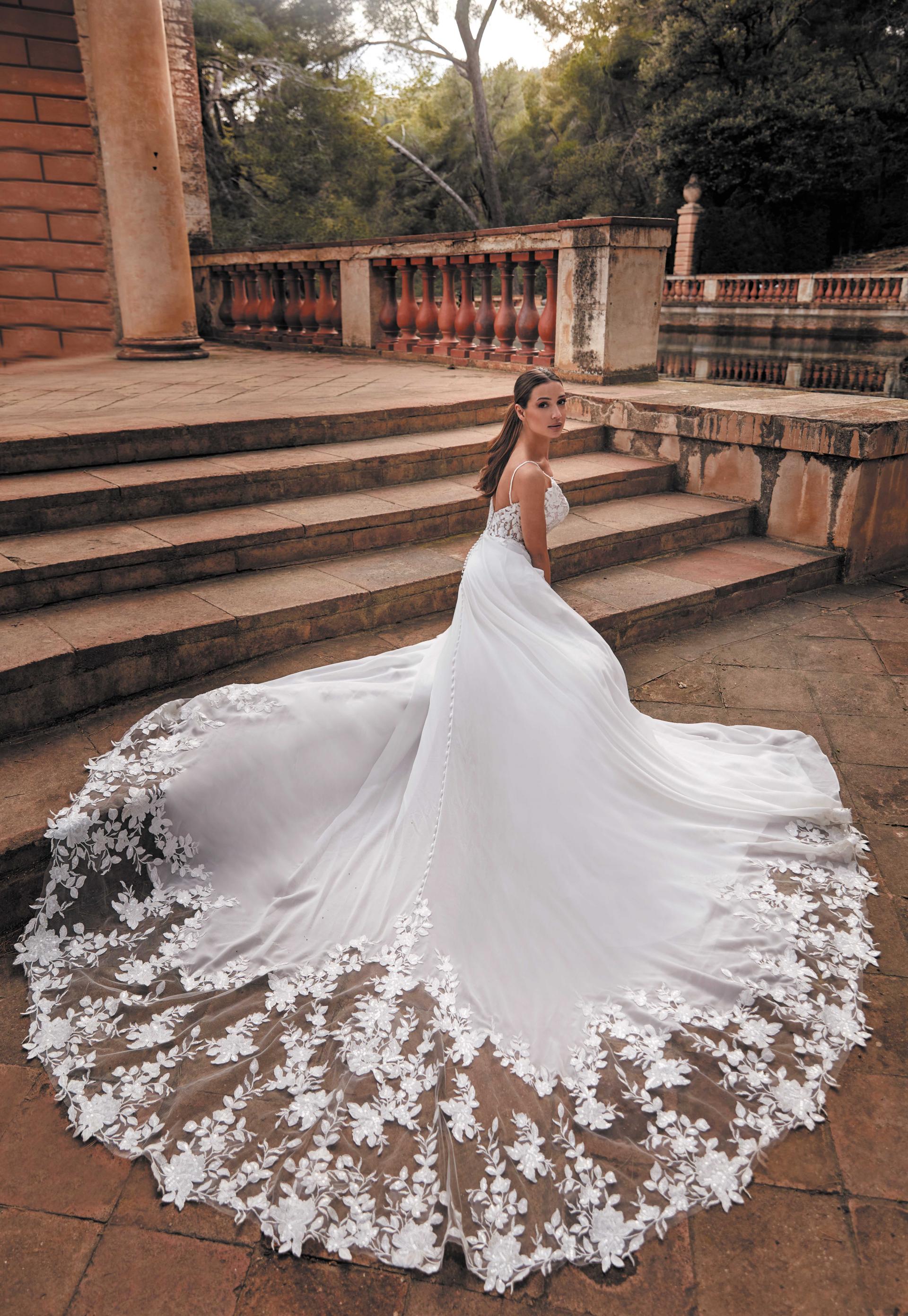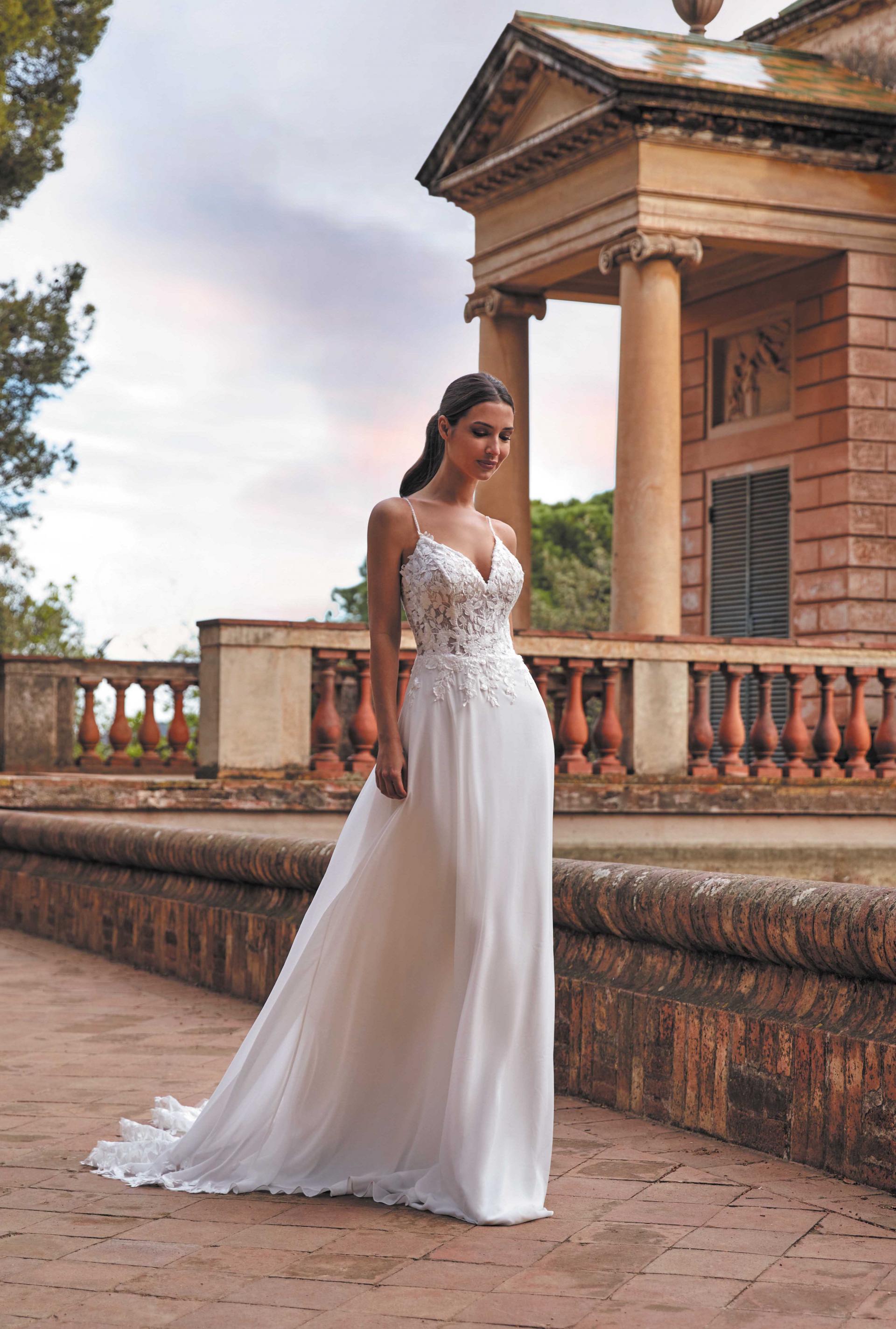 Robe de mariée en mousseline et dentelle. Top décolleté coeur en dentelle. Dos décolleté V et fines bretelles perlées. Jupe fluide en mousseline. Robe ivoire proposée en boutique.