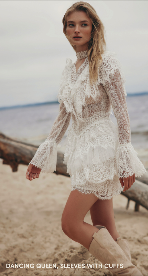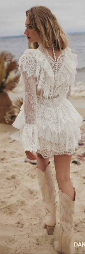 Robe de mariée courte en dentelle. Top décolleté V volanté en dentelle avec collier tour de cou. Dos en transparence avec finition boutons. Manches longues en dentelle finies par des volants. Jupe courte à volants en dentelle. Robe ivoire/nude disponible en boutique.