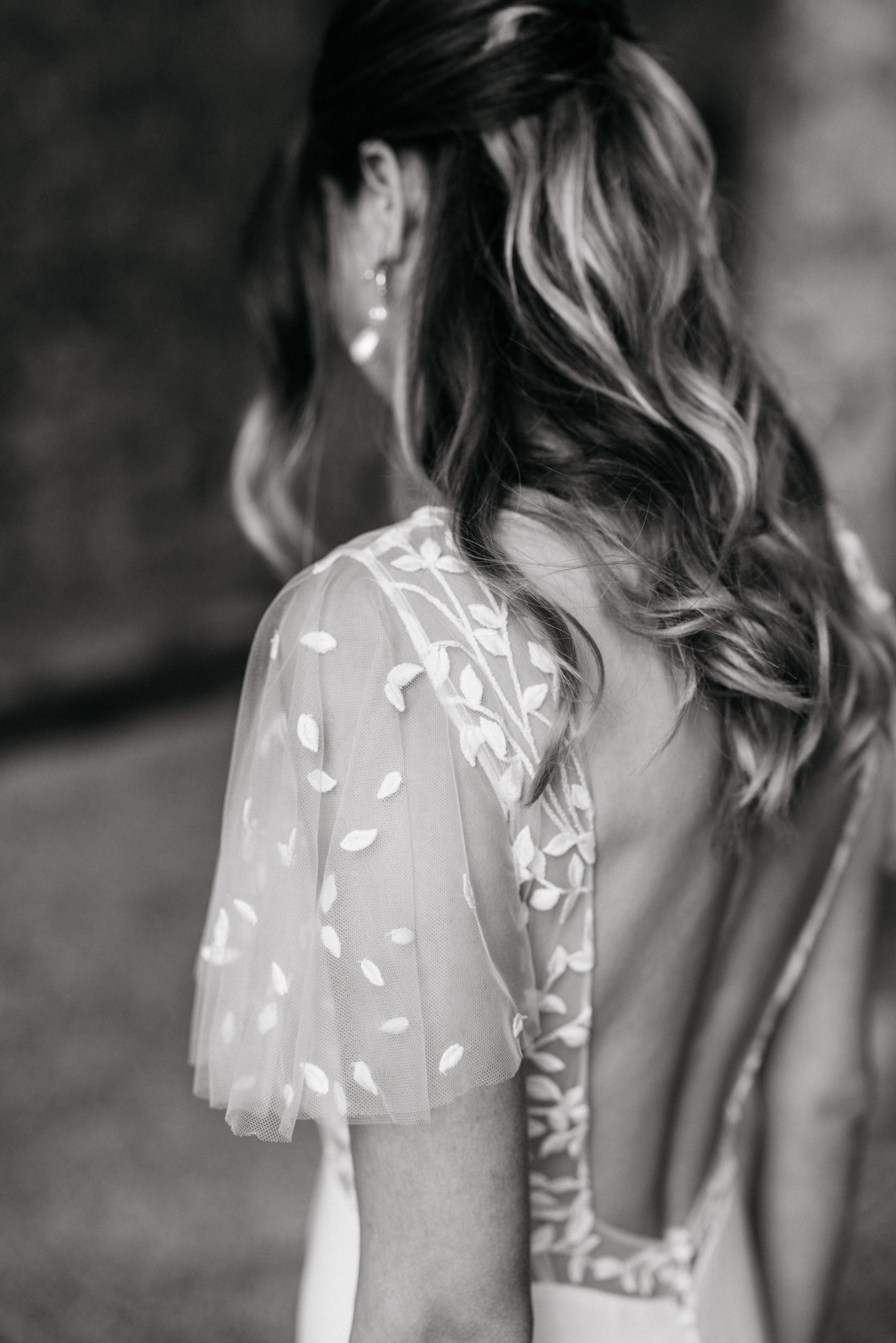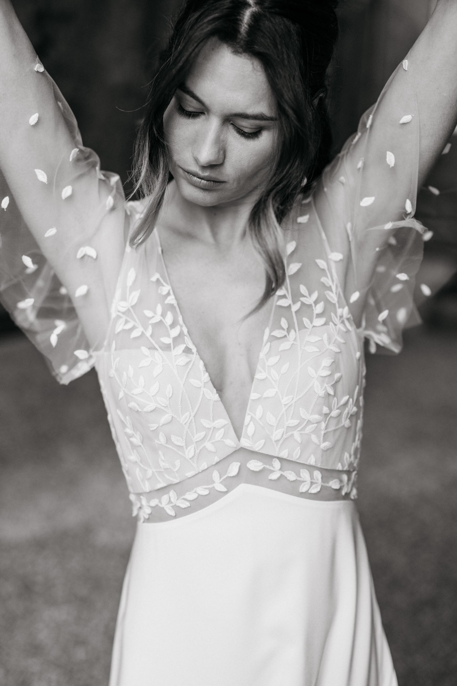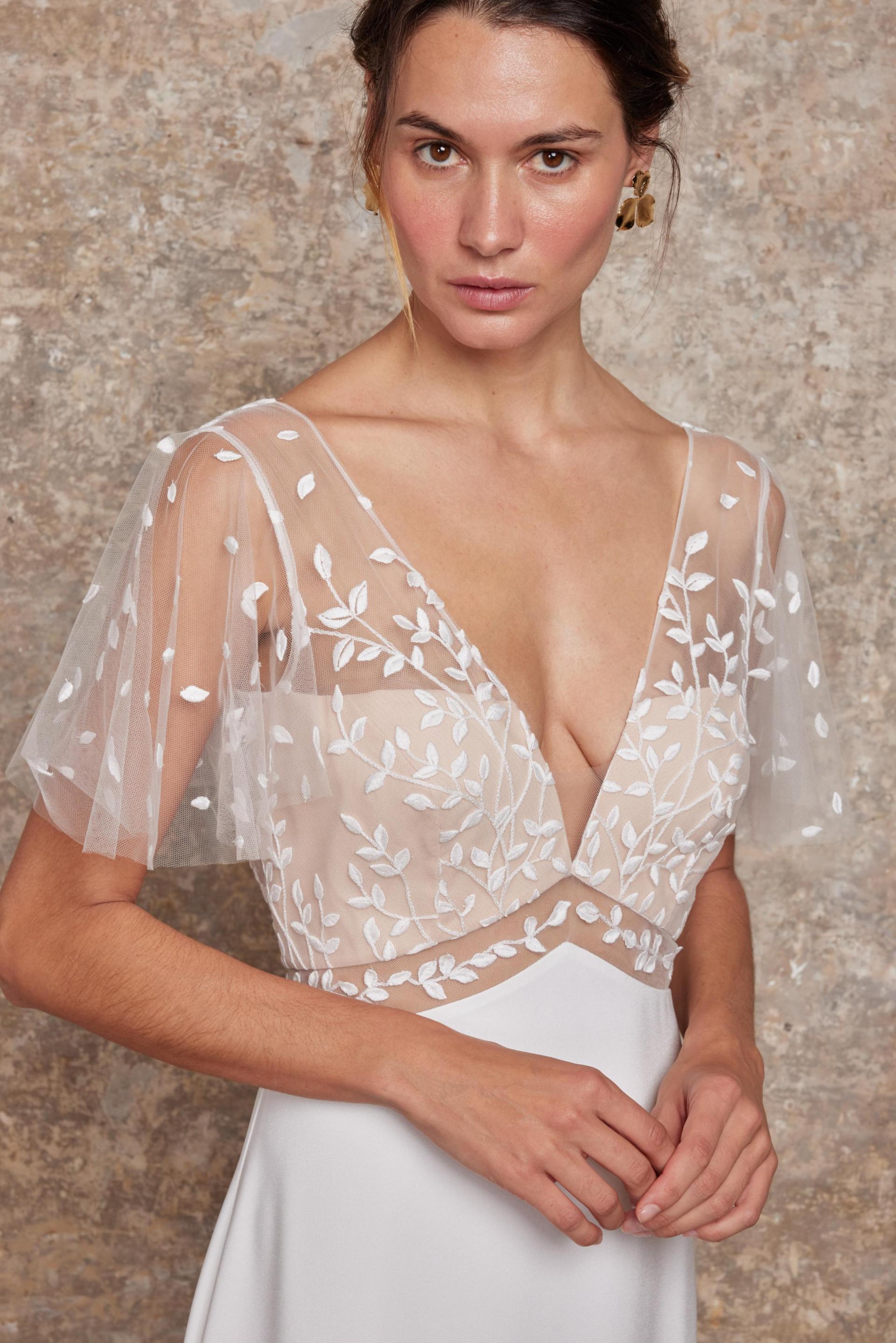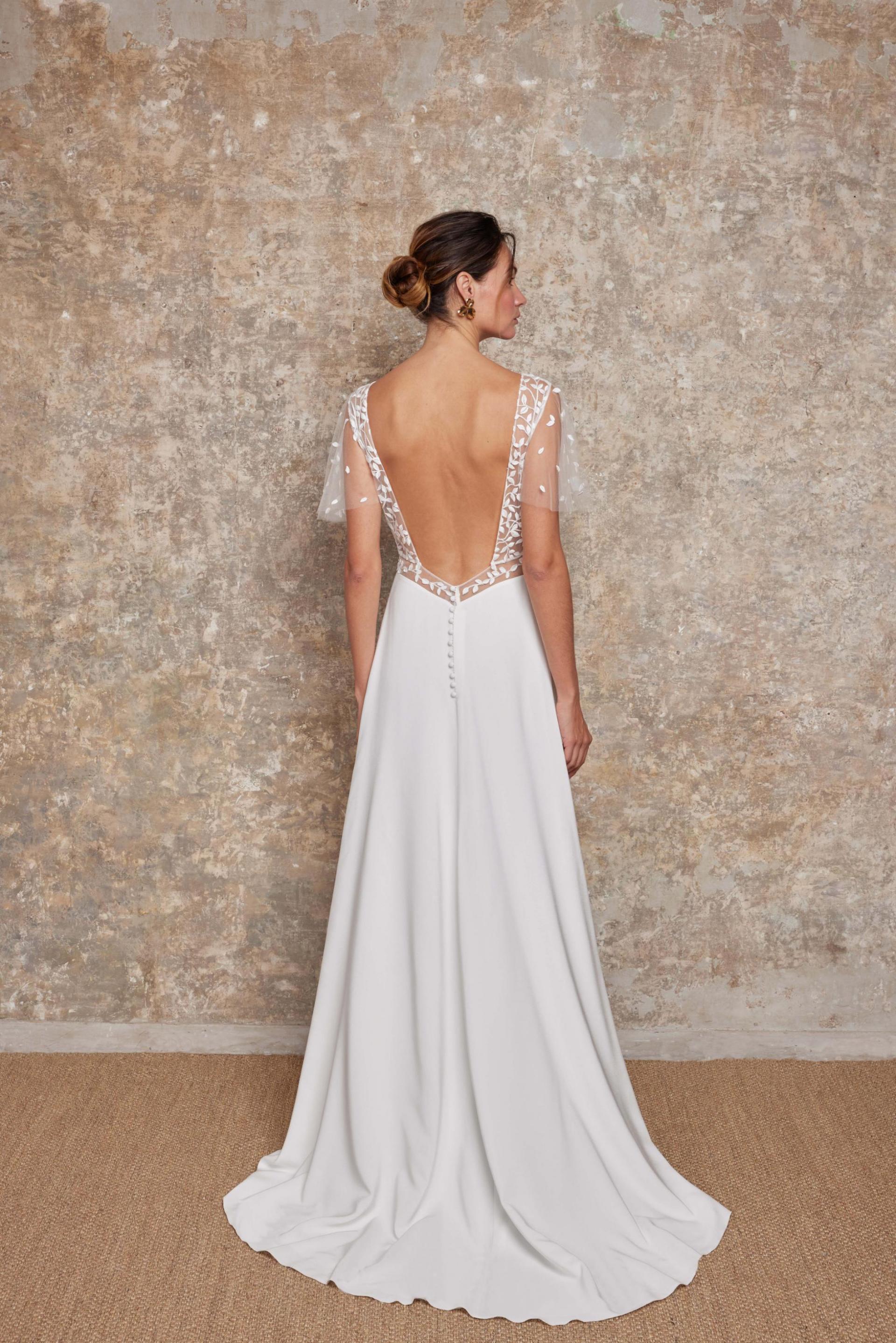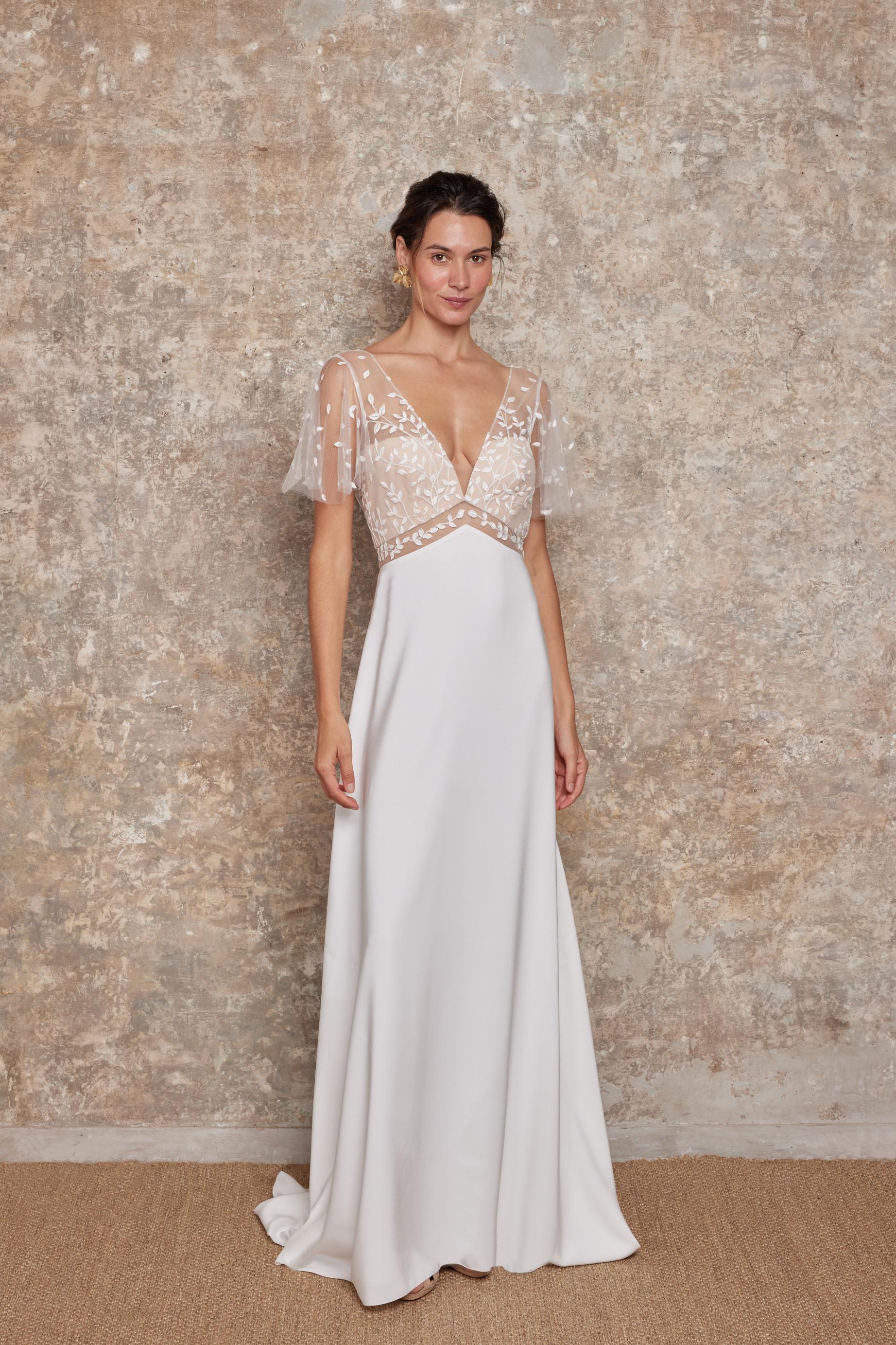 Robe de mariée en crèpe et dentelle. Top décolleté V, manches volants. Dos en V profond. Ceinture en transparence. Jupe fluide en crèpe. Robe ivoire disponible en boutique.