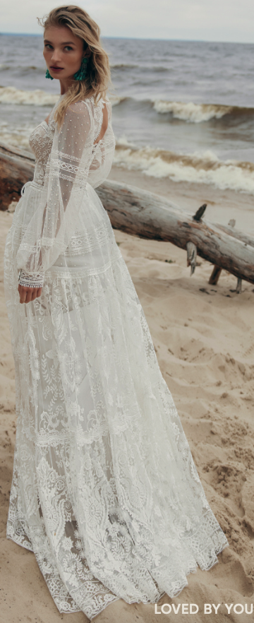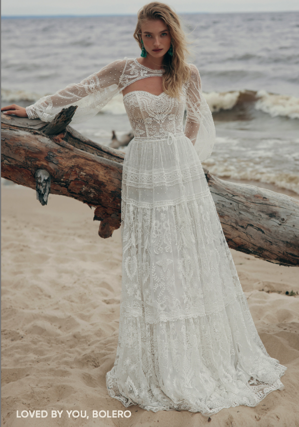 Robe de mariée en dentelle. Top bustier coeur en dentelle avec manches longues en dentelle. Jupe fluide en étages de dentelle. Robe ivoire/nude disponible en boutique.
