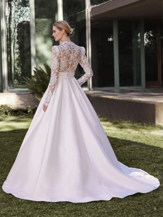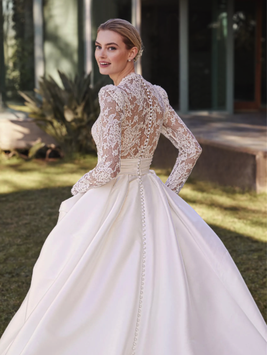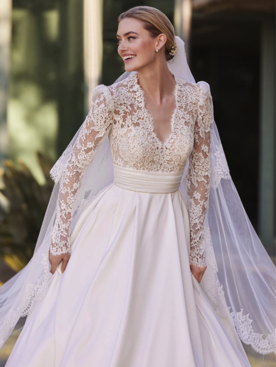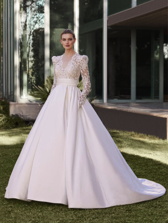 Robe de mariée en mikado souple/dentelle chantilly. Top décolleté V en dentelle transparente. Manches longues en dentelle. Dos boutonné. Ceinture large en mikado drapé. Jupe en A en mikado. Robe ivoire disponible en boutique, existe en commande avec avant top doublé.