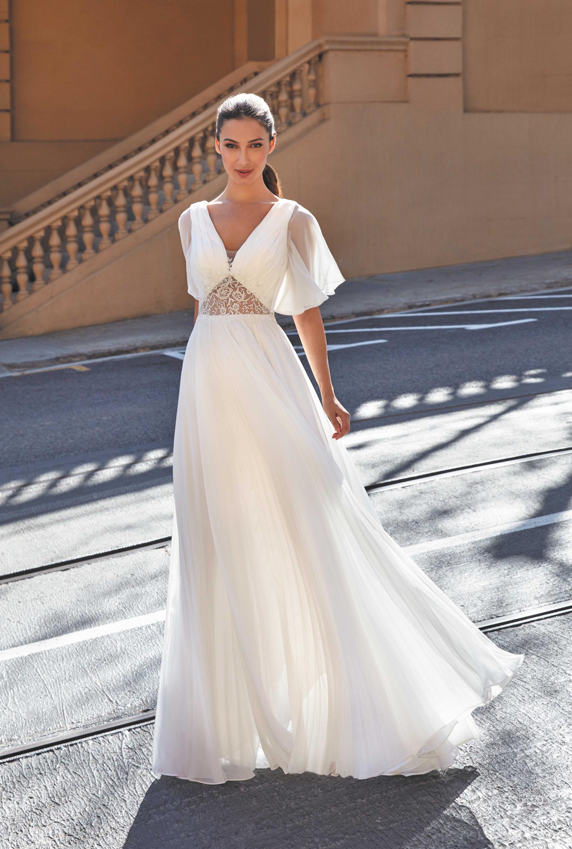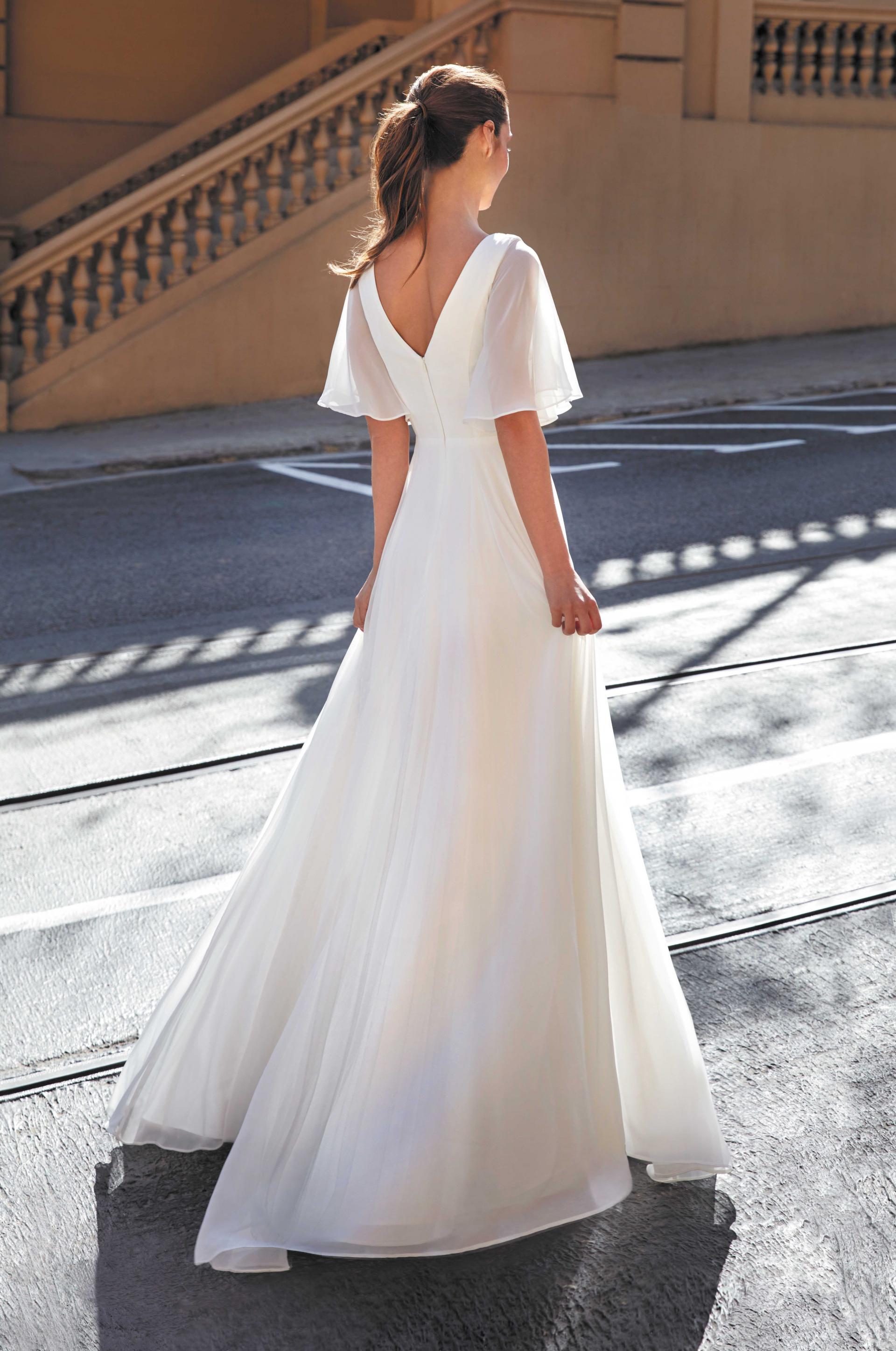 Robe de mariée en mousseline et dentelle. Top décolleté V en mousseline drapée. Manches volants, ceinture en transparence dentelle. Jupe fluide en mousseline. Robe ivoire proposée en boutique.