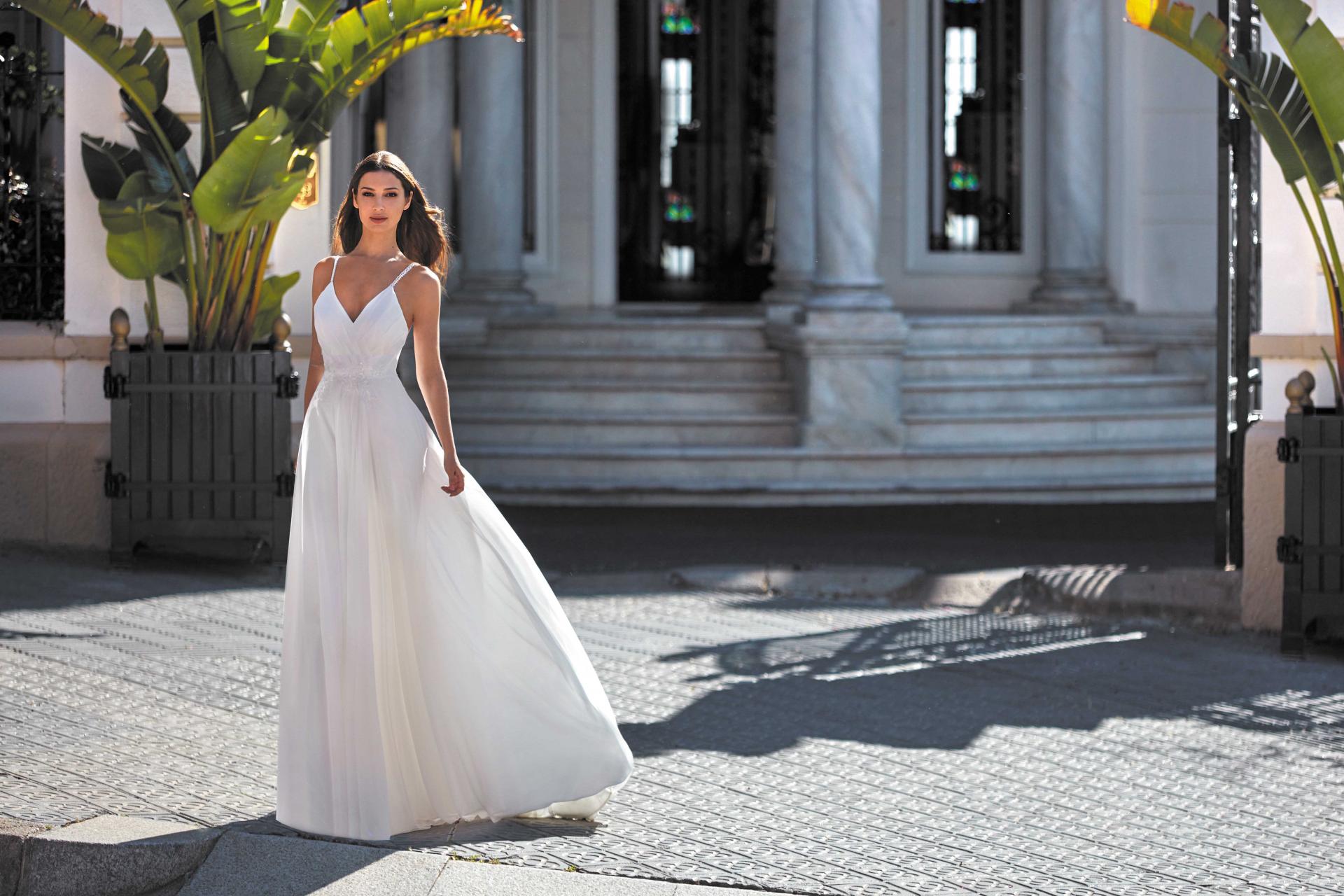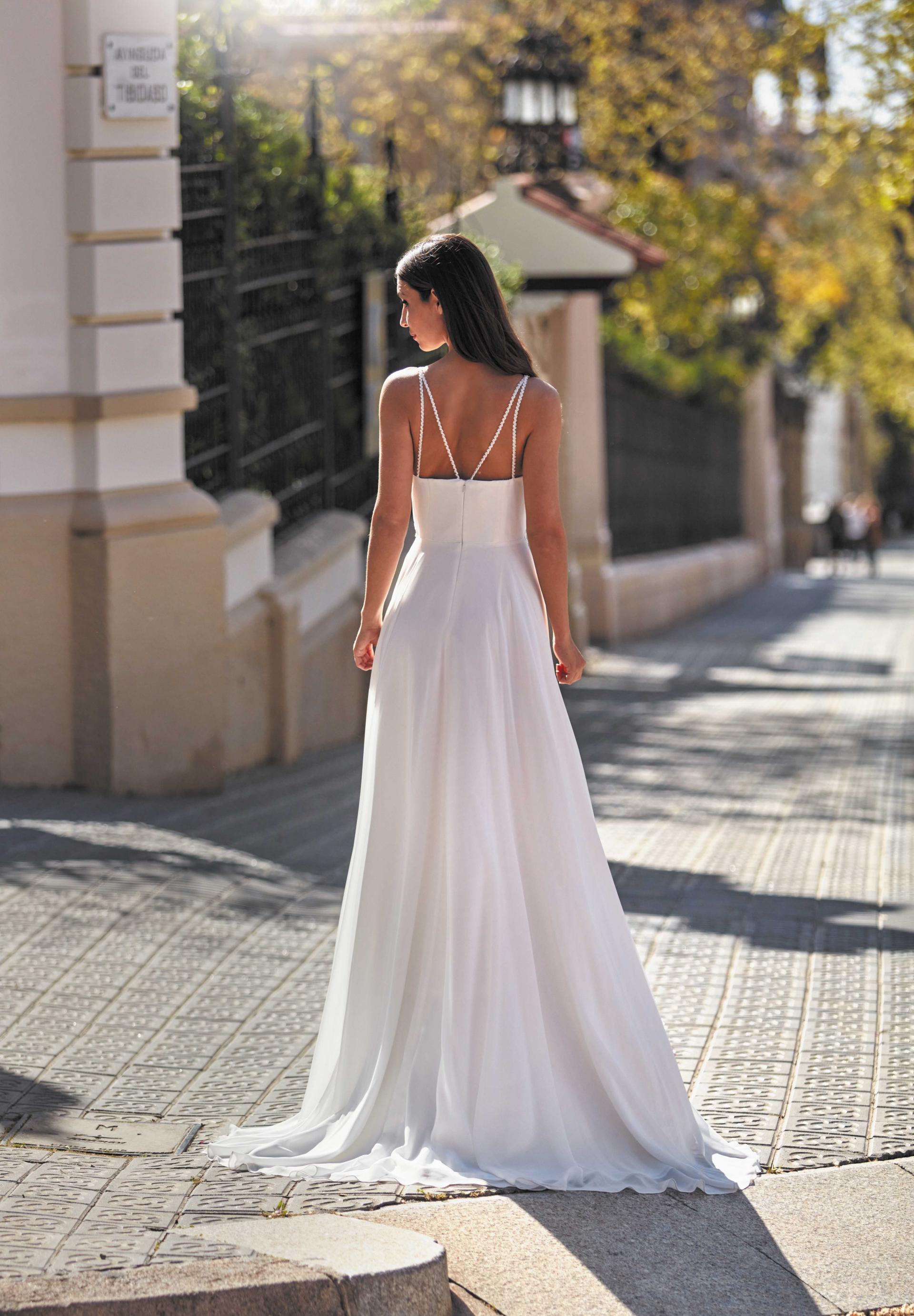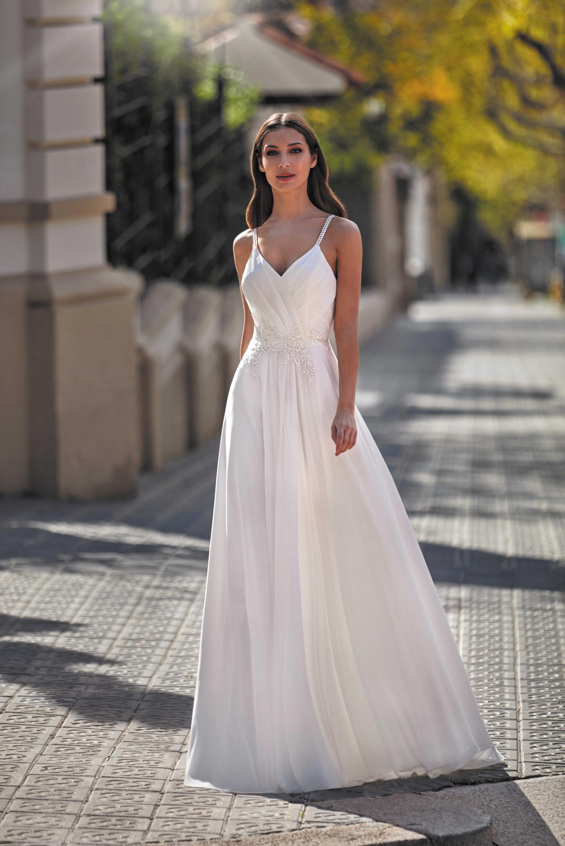 Robe de mariée en mousseline et dentelle. Top décolleté V en mousseline drapée avec ceinture en application de dentelles. Fines bretelles perlées. Jupe fluide en mousseline. Robe ivoire proposée en boutique.