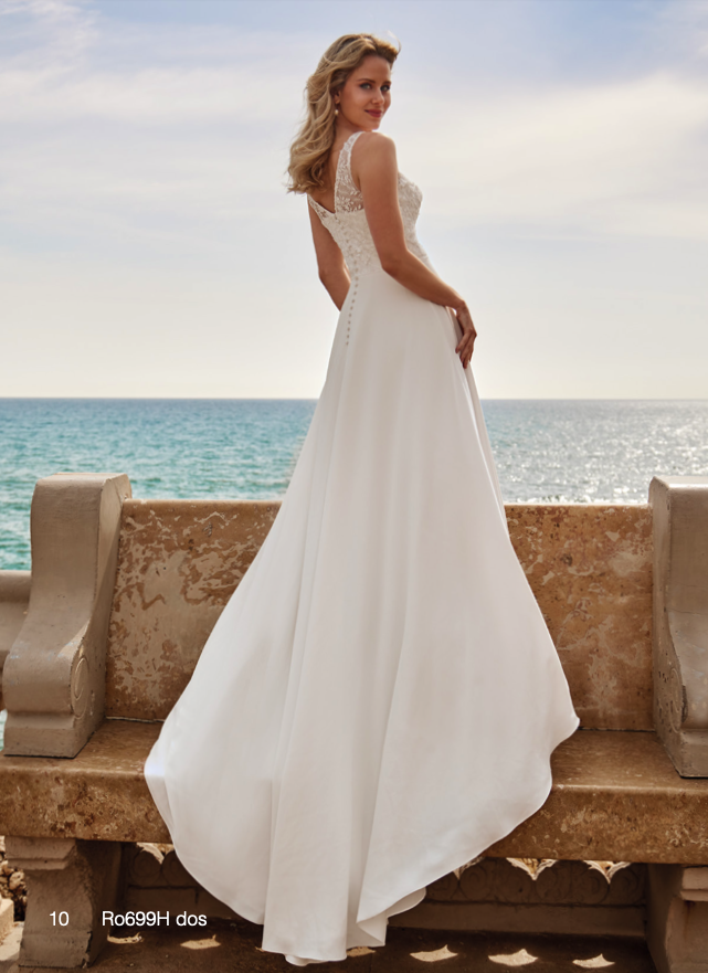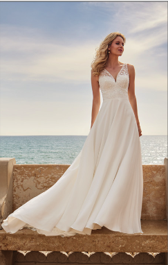 Robe de mariée en mousseline et dentelle. Top décolleté V en dentelle, doublure de l'avant de la robe forme coeur. Jupe fluide en mousseline. Robe ivoire proposée en boutique.