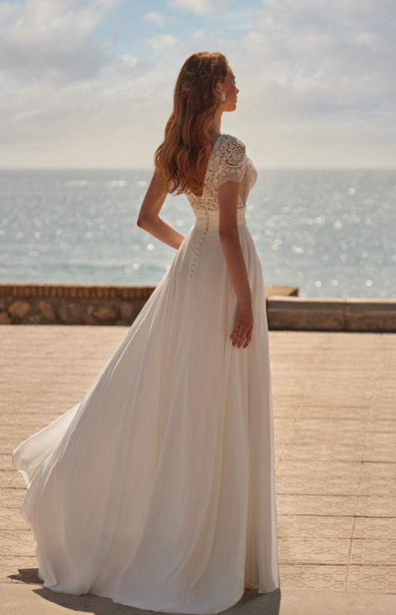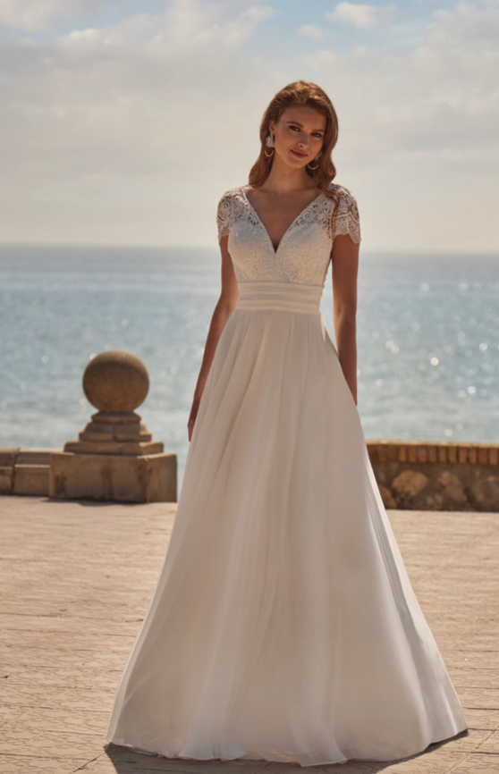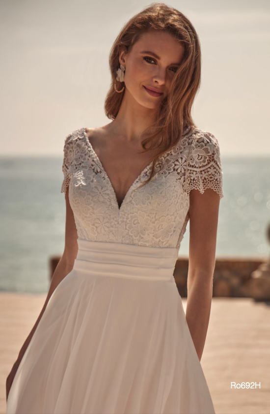 Robe de mariée en mousseline et dentelle. Top décolleté V en dentelle, doublure top forme coeur. Manches courtes en dentelle, ceinture drapée en mousseline. Jupe fluide en mousseline. Robe ivoire proposée en boutique.