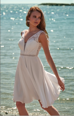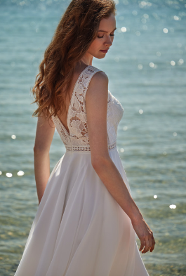 Robe de mariée en mousseline et dentelle. Top décolleté coeur en dentelle, doublure de l'avant forme coeur. Dos décolleté V. Jupe courte en mousseline. Robe ivoire proposée en boutique.