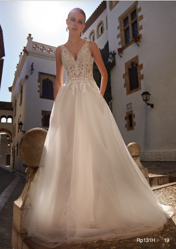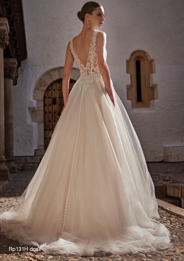 Robe de mariée en tulle et dentelle. Top décolleté V en dentelle. Dos décolleté V. Jupe forme A en tulle et dentelle. Robe ivoire/nude proposée en boutique.