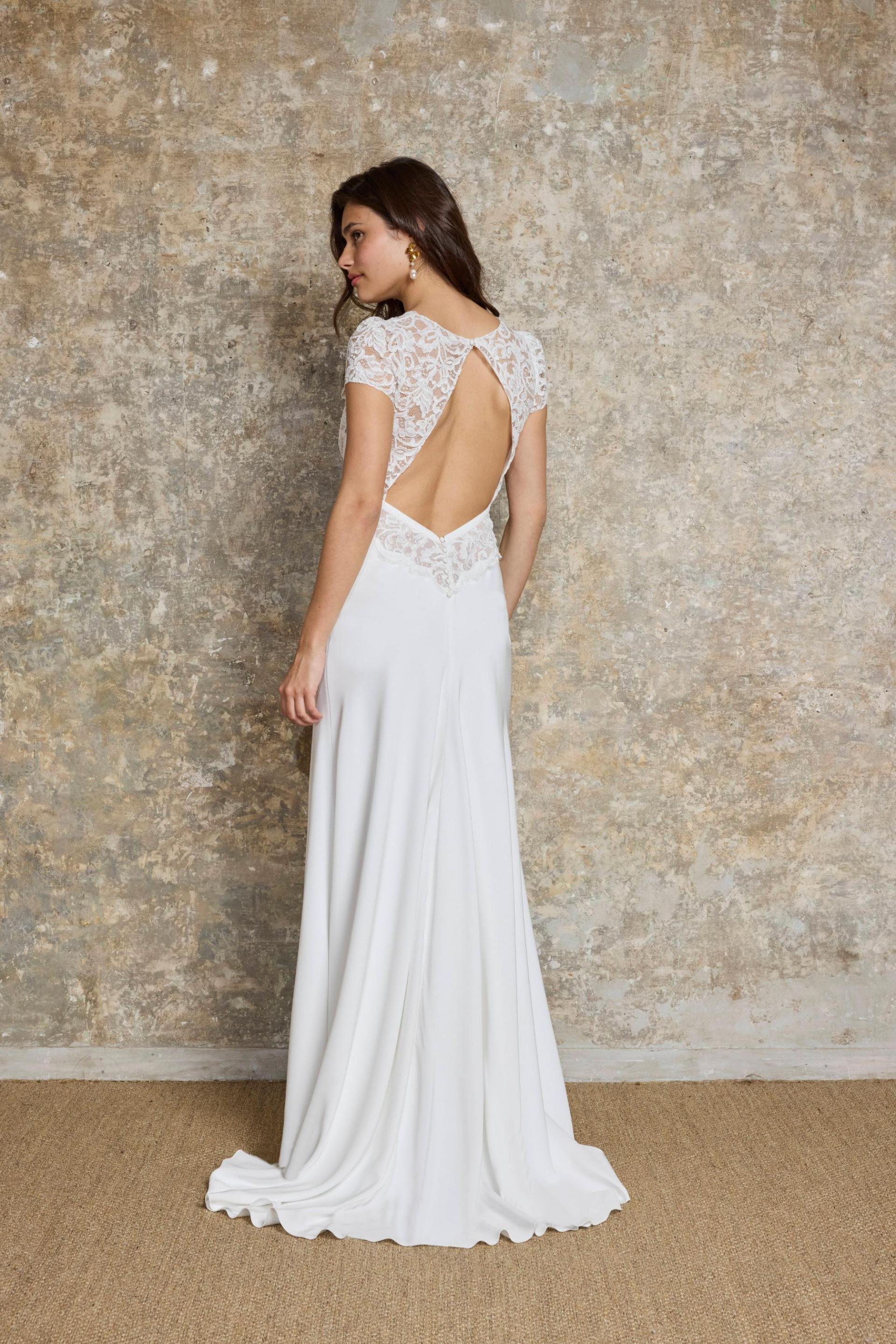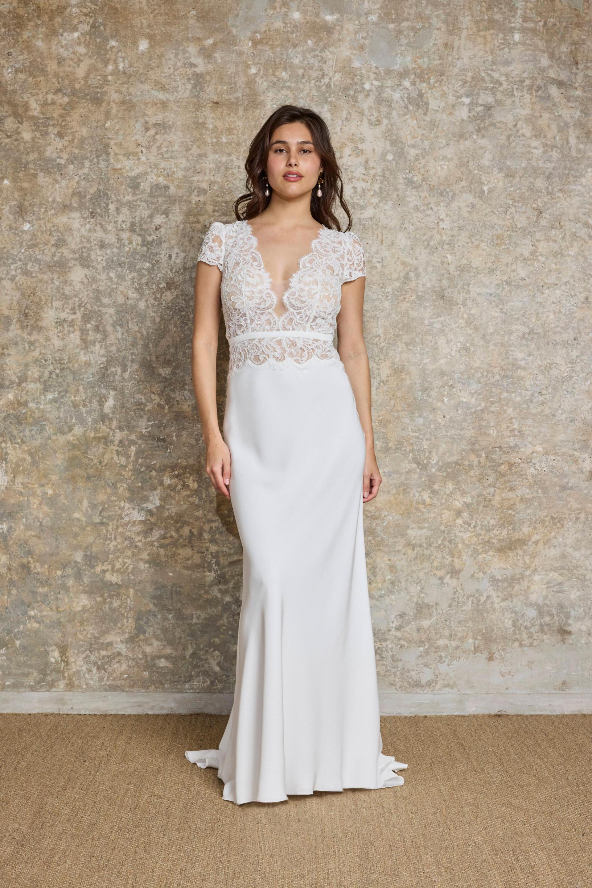 Robe de mariée en crèpe et dentelle. Top décolleté V, petites manches dentelle. Dos en transparence forme V inversé. Ceinture en transparence. Jupe fluide en crèpe. Robe ivoire disponible en boutique.