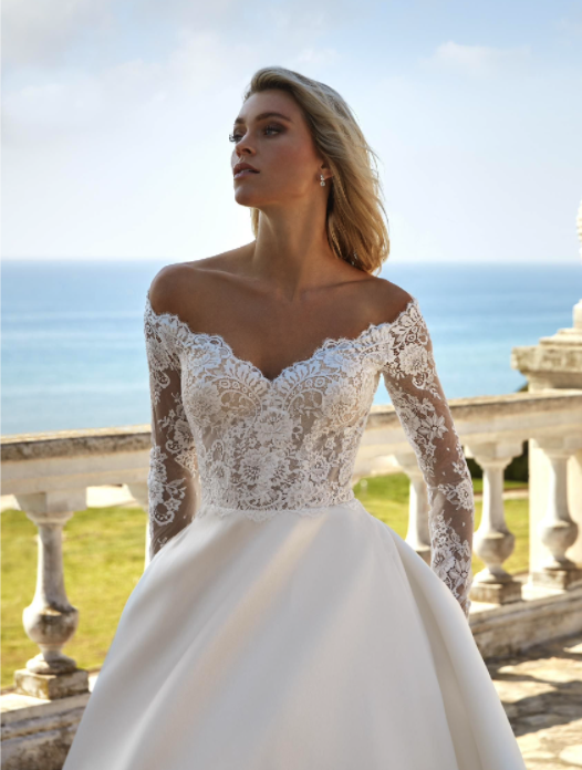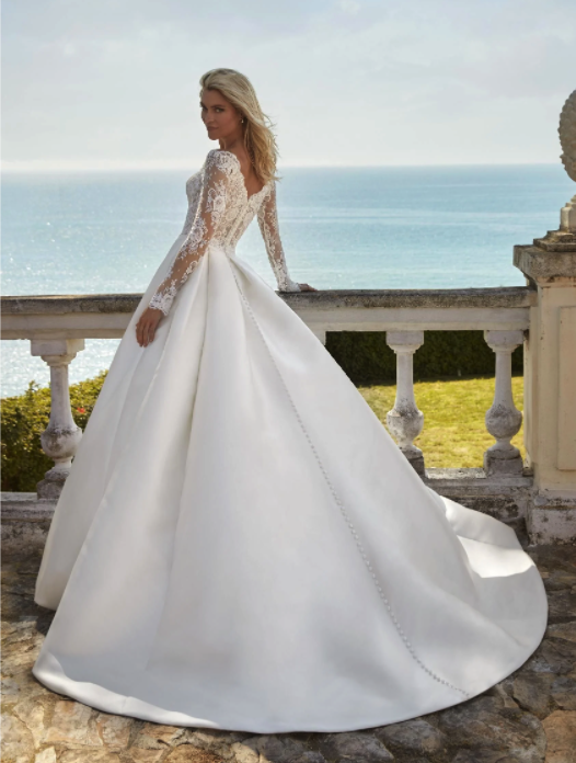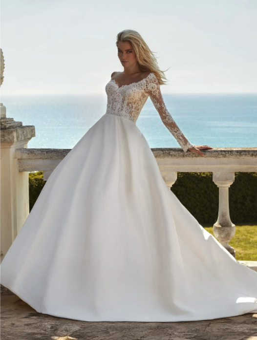 Robe de mariée en mikado et dentelle. Top décolleté bateau en dentelle transparente. Manches longues dentelle. Jupe ample en mikado. Robe ivoire disponible en boutique.